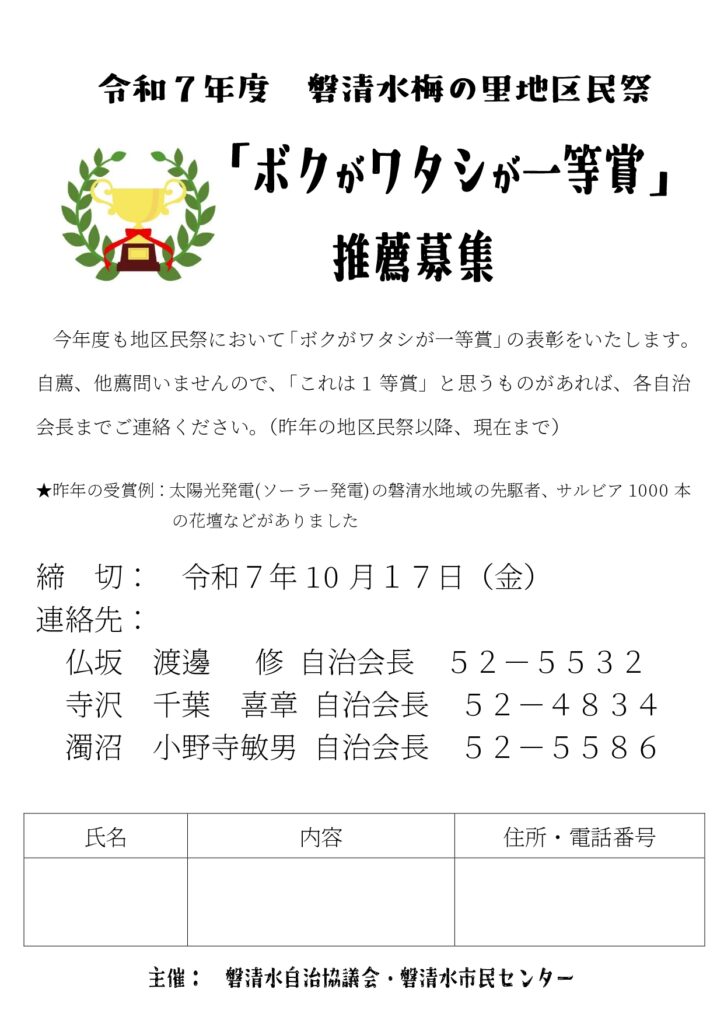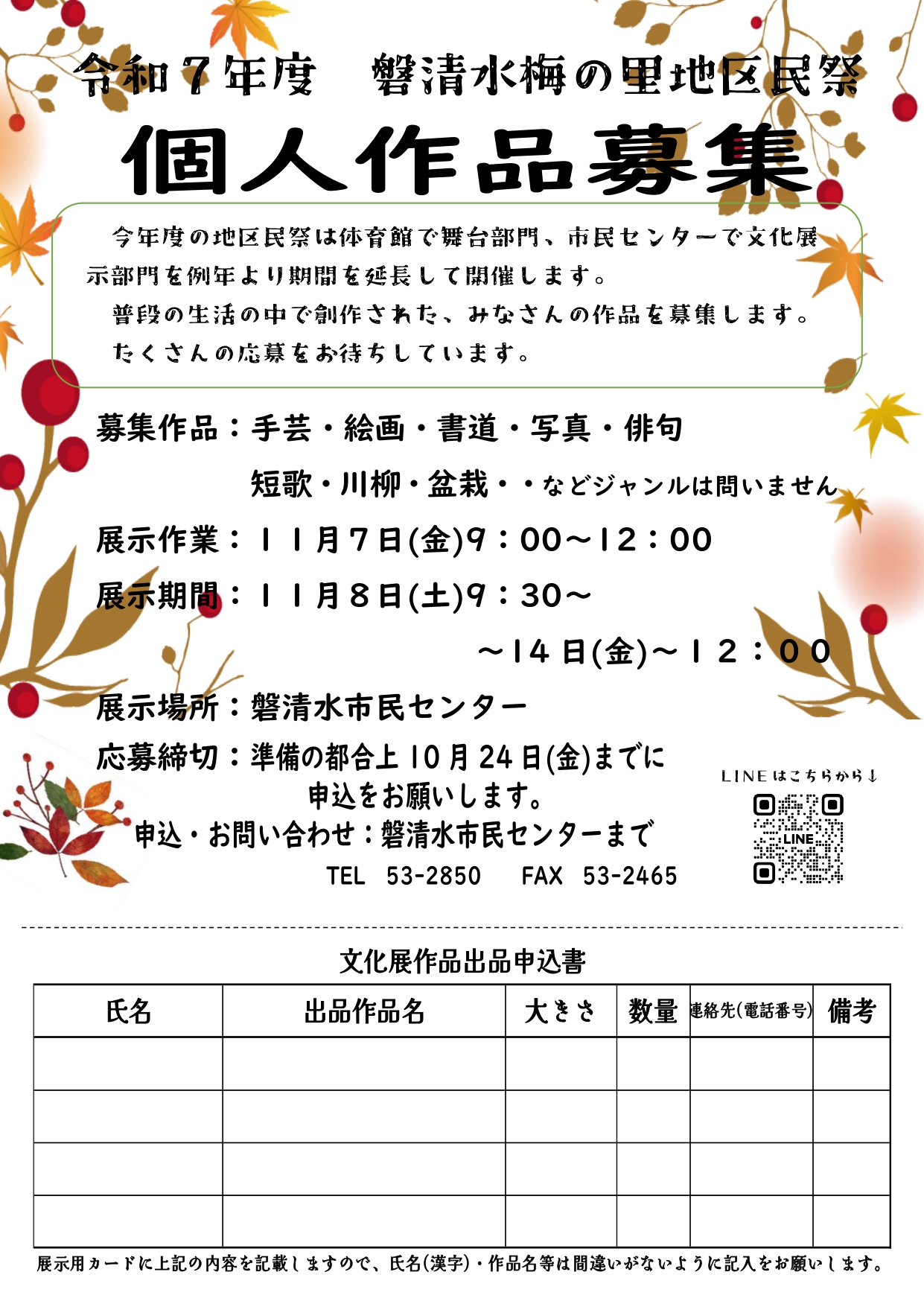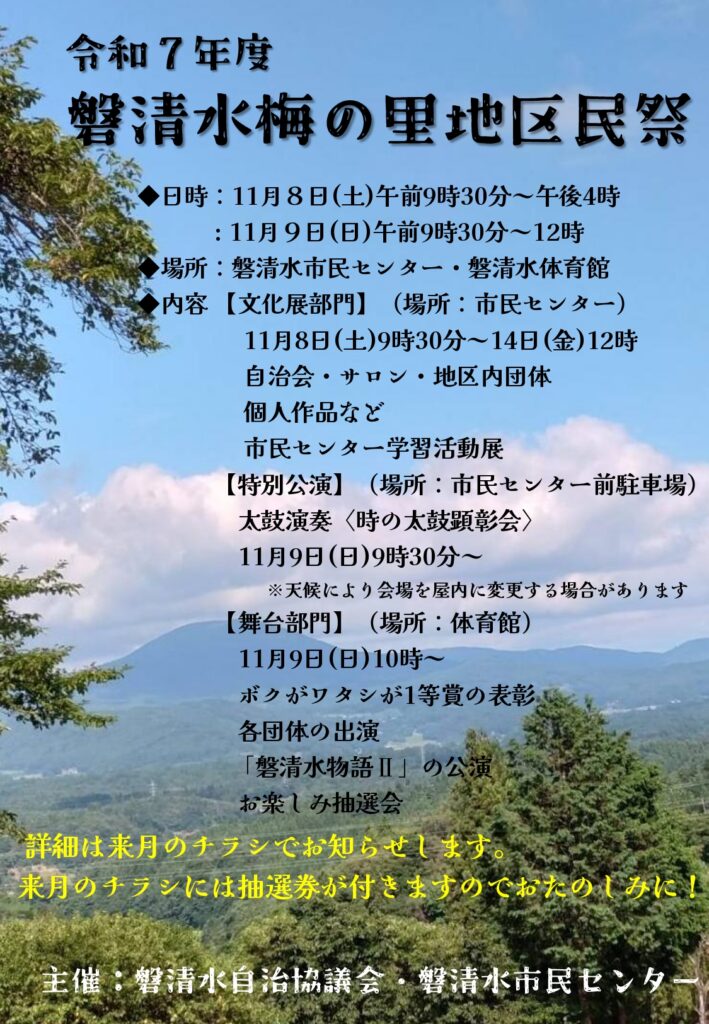 毎年恒例の「磐清水梅の里地区民祭」が、11/8(土)・11/9(日)に開催されます。