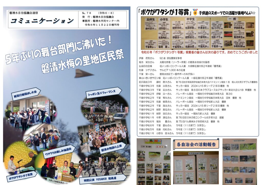 令和6年度11月の磐清水自治協議会通信「コミュニケーション」と、磐清水市民センターだよりを掲載しました。今月の「コミュニケーション」は地区民祭を特集した増刊号付きです。下の画像をクリックすると拡大して見ることができます。 PDFダウンロード PDFダウンロード PDFダウンロード