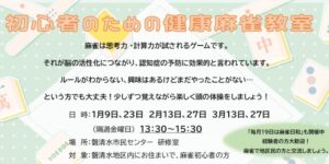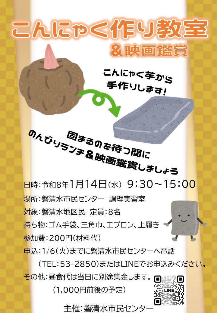 【1/14】こんにゃく作り教室 開催のお知らせ 2025-12-24 最終更新日時 : 2025-12-24 管理人_小野寺 1/14(水)9:30から「こんにゃく作り教室」を開催します。地域の方が育てたこんにゃく芋から、美味しいこんにゃくを手作りします。固まるのを待つ間、ランチを食べながらのんびり映画鑑賞しましょう。詳しい内容はチラシをご確認ください。
