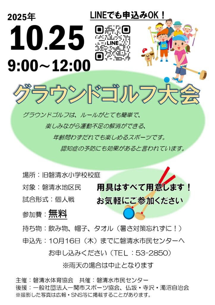 【10/25】第3回グラウンドゴルフ大会 開催のお知らせ 2025-09-30 最終更新日時 : 2025-09-30 管理人_小野寺 10/25(土)9時から旧磐清水小学校校庭にて、磐清水体育協会主催のグラウンドゴルフ大会が開催されます。年3回行われる予定のうち、第3回目です。用具は主催者が準備しますので、お持ちでない方も参加OKです。 詳しい内容はチラシをご確認ください。皆様のご参加お待ちしております。