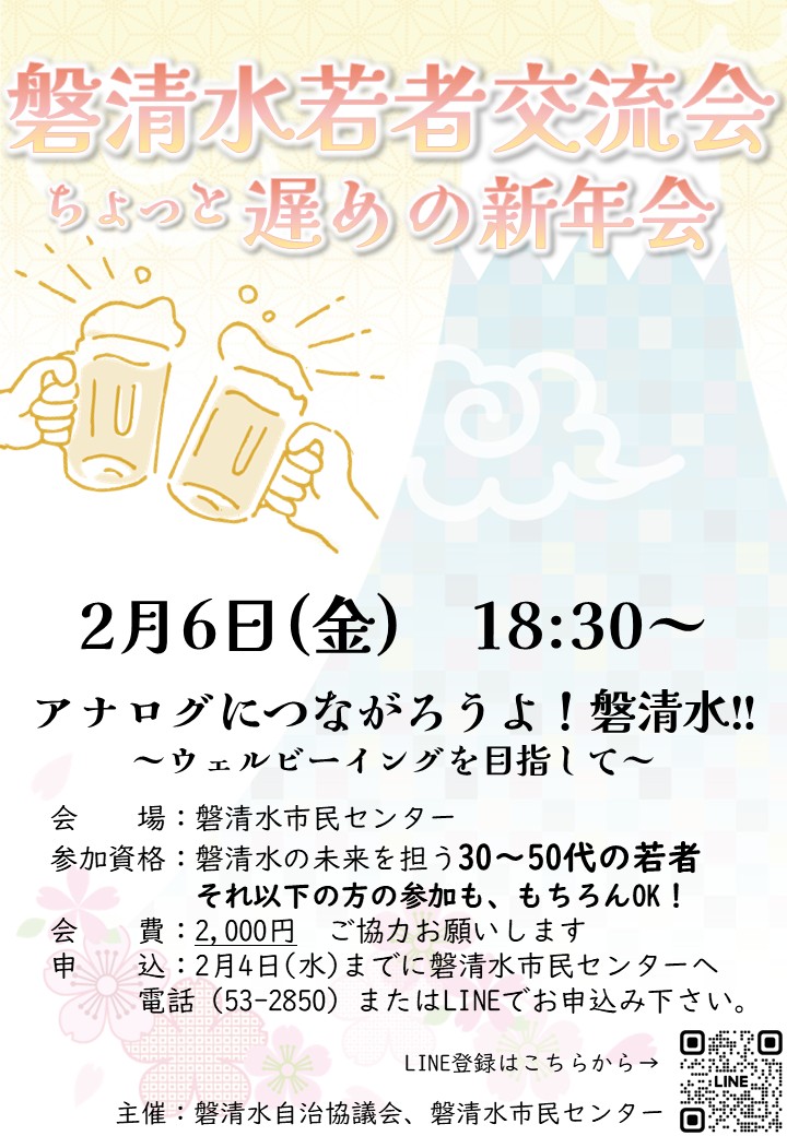 【2/6】R7年度磐清水若者交流会 ちょっと遅めの新年会 開催のお知らせ 2025-12-24 最終更新日時 : 2025-12-24 管理人_小野寺 2/6(金) 18:30から磐清水市民センターを会場に、「磐清水若者交流会 ちょっと遅めの新年会」を開催します。2025年の思い出を振り返りながら、食べて飲んで交流を深めましょう。対象:磐清水の未来を担う”30~50代“の方。もちろんそれ以下の若者も参加OKです。会費:2,000円申込:参加希望の方は、2/4(水)までに磐清水市民センターへ申込みをお願いします。